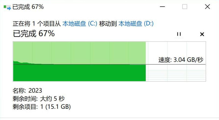出乎意料的是,从PCIe4.0硬盘拷贝40GB的大文件到佰维X570 PRO上,速度竟然能稳定在每秒3GB左右,全程非常流畅,没有像以前那样中途掉速或卡顿。